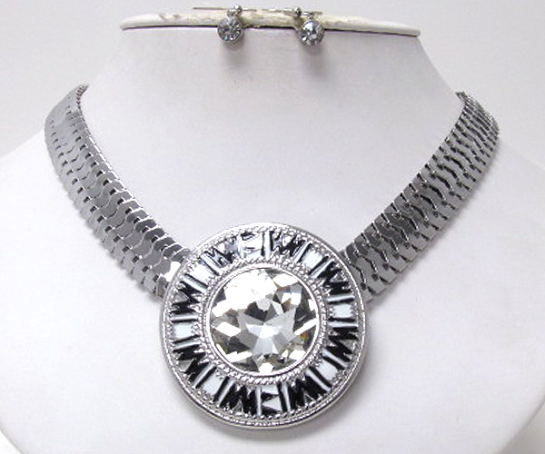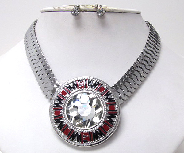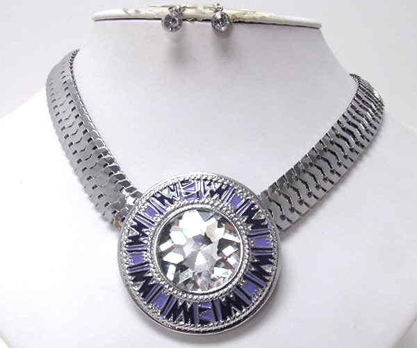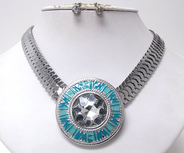 Facet glass and metal round shield epoxy drop and flat snake chain necklace earring set