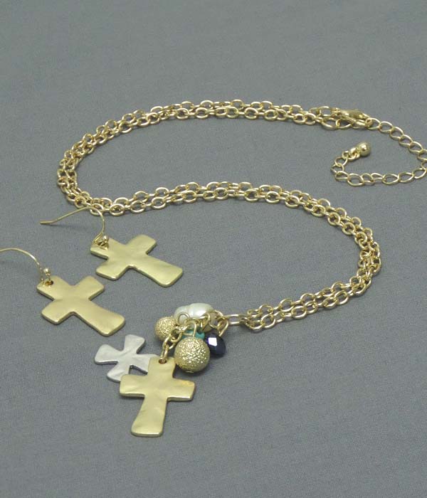 WHOLESALE HAMMERED CROSS AND PEARL PENDANT NECKLACE EARRING SET 401211