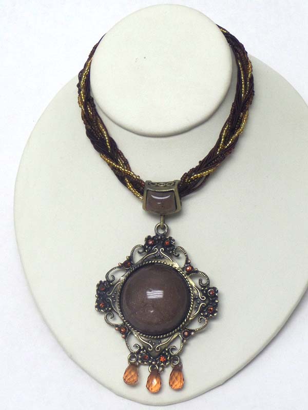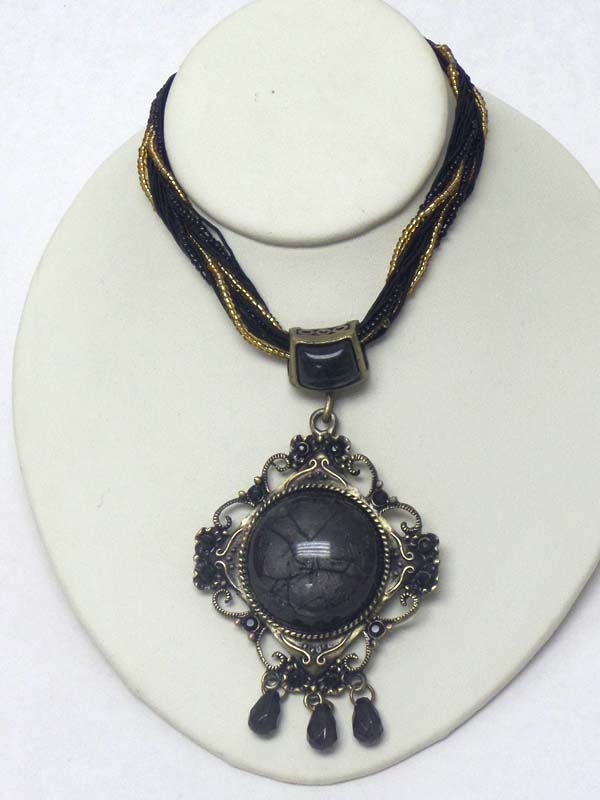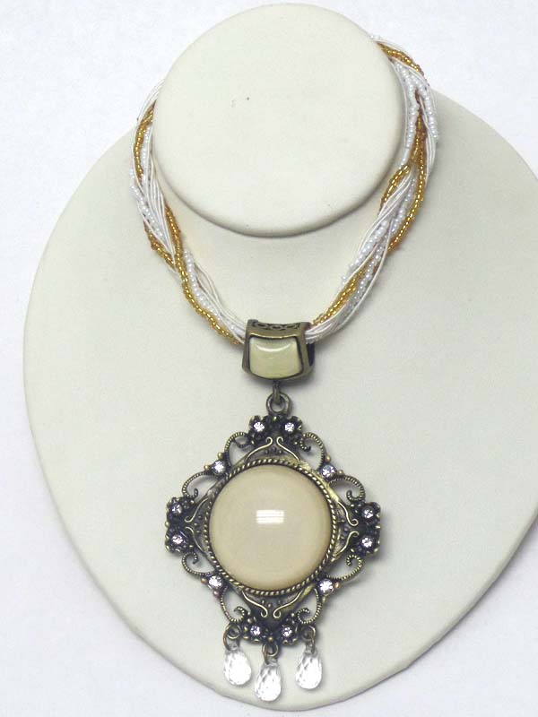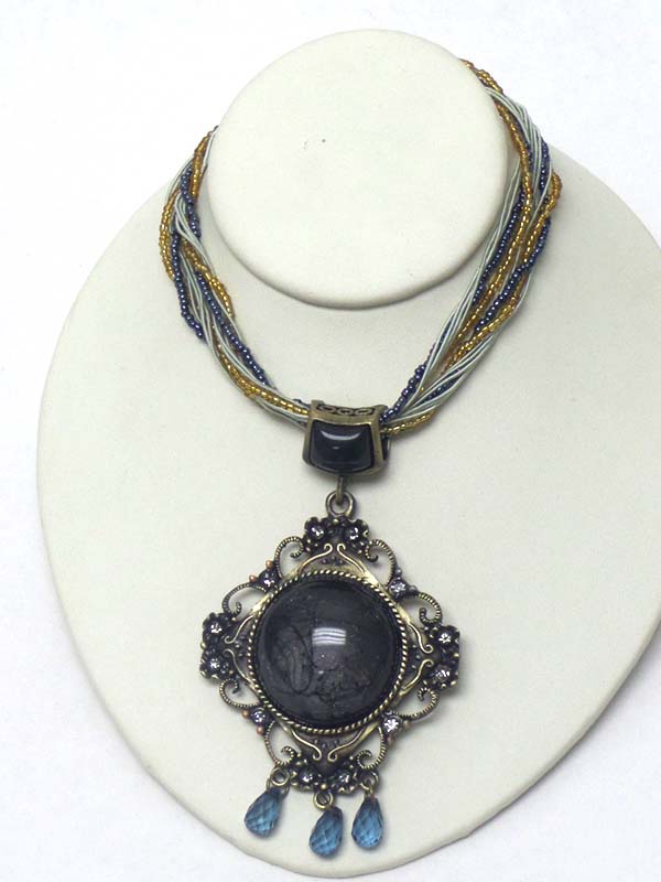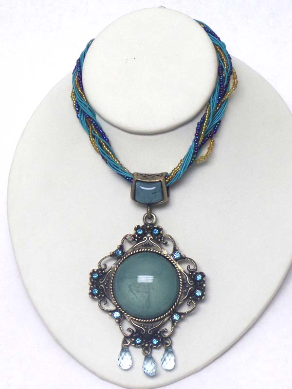 Center puffy stone and metal filigree pendant multi seed bead chain mix necklace