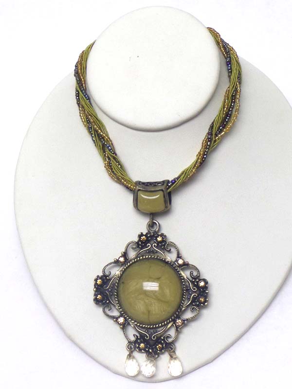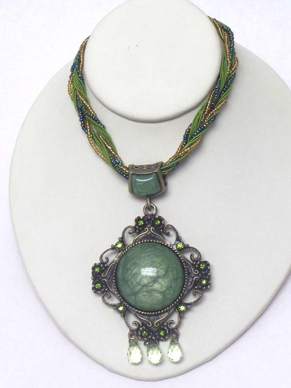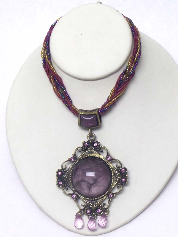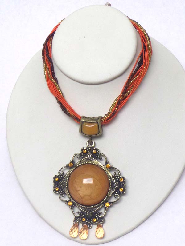 WHOLESALE CENTER PUFFY STONE AND METAL FILIGREE PENDANT MULTI SEED BEAD CHAIN MIX NECKLACE 401258
