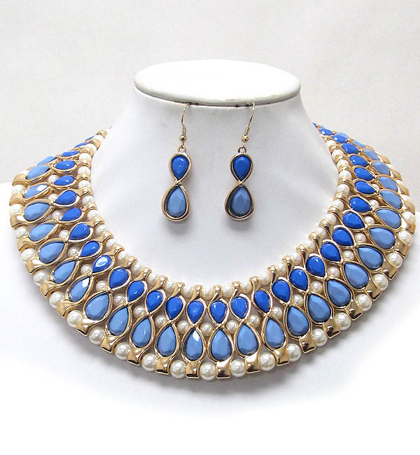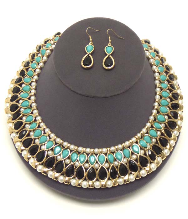 WHOLESALE LUXURY LINE MULTI PEARL AND TEARDROP STONE MIX NECKLACE EARRING SET 402149