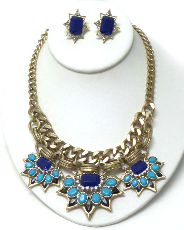 Crystal and acrylic stone mix on thick chain aztec statement necklace earring set -western