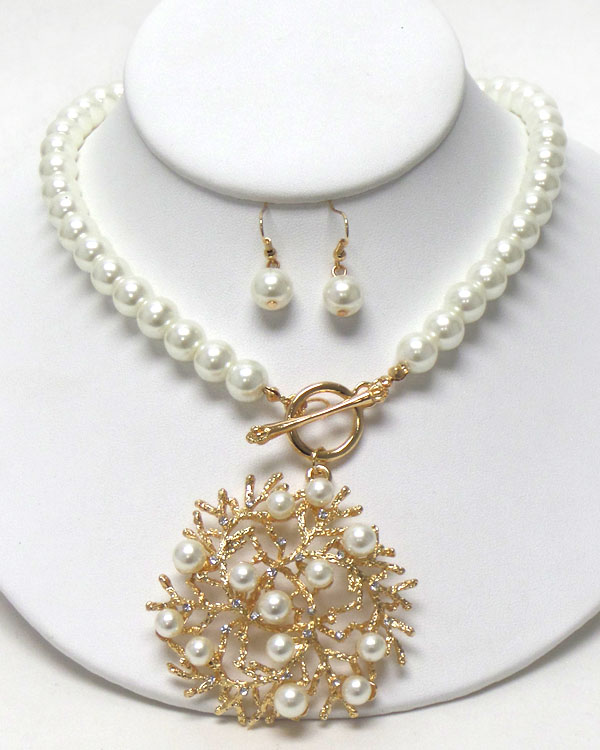WHOLESALE MULTI PEARL ON METAL FILIGREE CORAL PENDANT AND PEARL CHAIN NECKLACE EARRING SET 403750