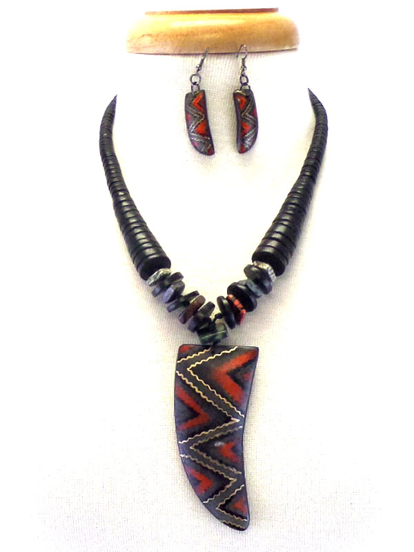 WHOLESALE AZTEC PATTERN WOOD PENDANT AND BEADS NECKLACE EARRING SET -WESTERN 404834