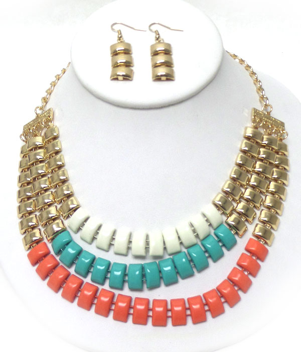 WHOLESALE 3 LAYERED AND COLOR PRINT METAL CHAIN NECKLACE EARRING SET 404838