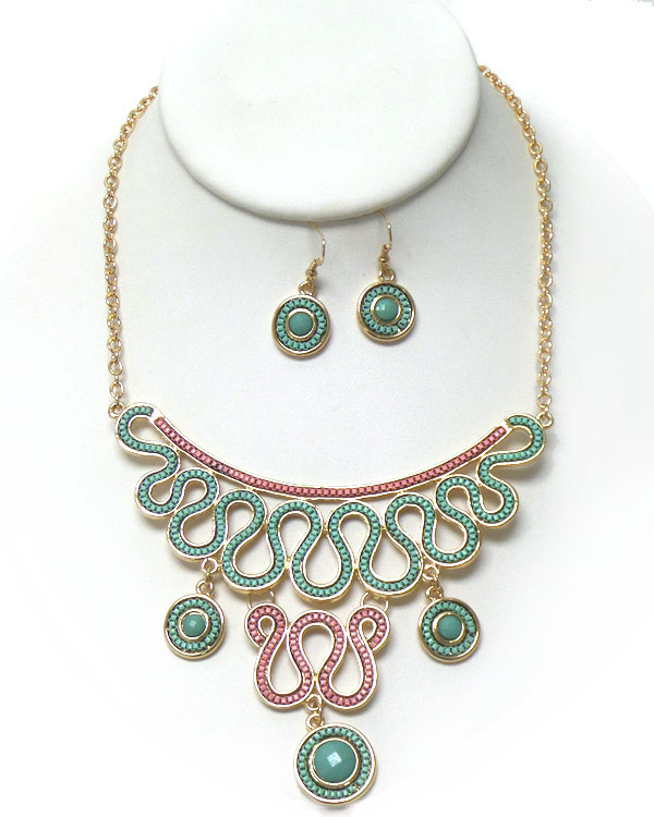 WHOLESALE PAINTED TUB CHAIN ON WAVY METAL FILIGREE AND CRYSTAL CENTER DISK DROP STATEMENT NECKLACE EARRING SET 405306