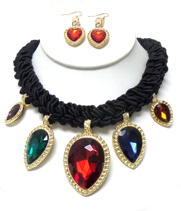 Black twisted rope with crystal drop necklace set
