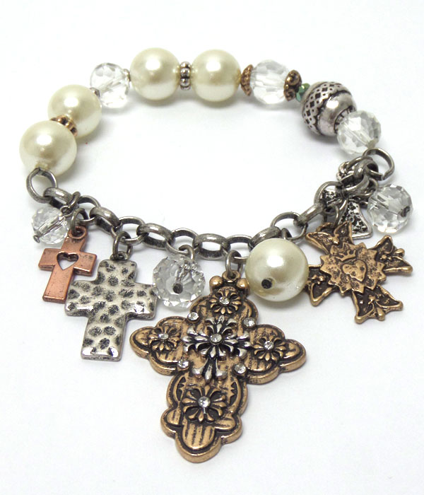 WHOLESALE VINTAGE LOOK MULTI TEXTURED CROSS CHARM AND PEARL CHAIN STRETCH BRACELET 407172