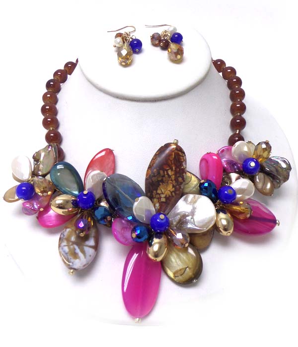 WHOLESALE SEMI PRECIOUS STONE AND SHELL MULTI FLOWER NECKLACE SET 408114