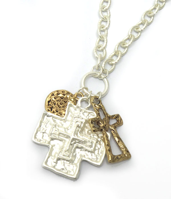 WHOLESALE TWO TEXTURED METAL CROSSES NECKLACE 408203