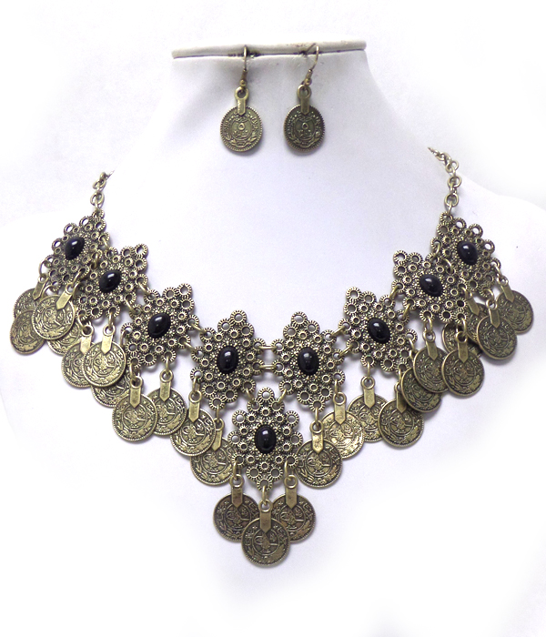 Metal linked coins drop with stones necklace set