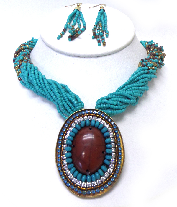WHOLESALE TRIBAL LOOK TWISTED MULTI BEAD WITH OVAL PENDANT NECKLACE SET 409004