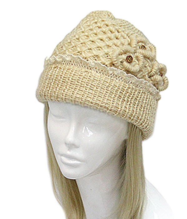 WHOLESALE VINTAGE LACE AND BUTTON ACCENT CROCHET BEANIE 409017