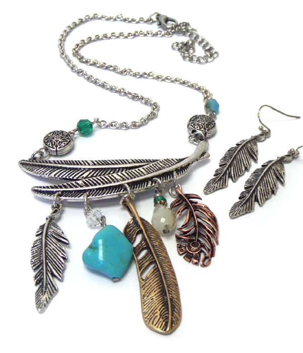 WHOLESALE BURNISH METAL FEATHER DANGLE NECKLACE EARRING SET 409084