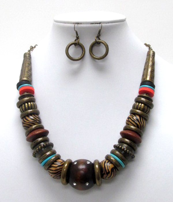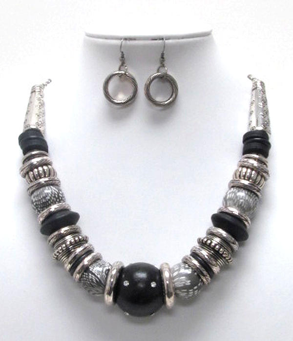 WHOLESALE TRIBAL LOOK WOOD AND TEXTURED METAL BALL NECKLACE SET 410859