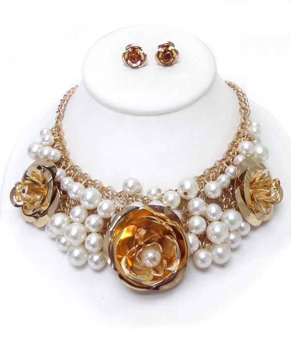 WHOLESALE TRIPLE METAL ROSE AND MULTI PEARL STATEMENT NECKLACE SET 412088