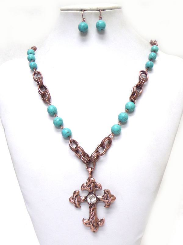 WHOLESALE STONES WITH METAL TEXTURE LINKS CROSS DROP NECKLACE 413497