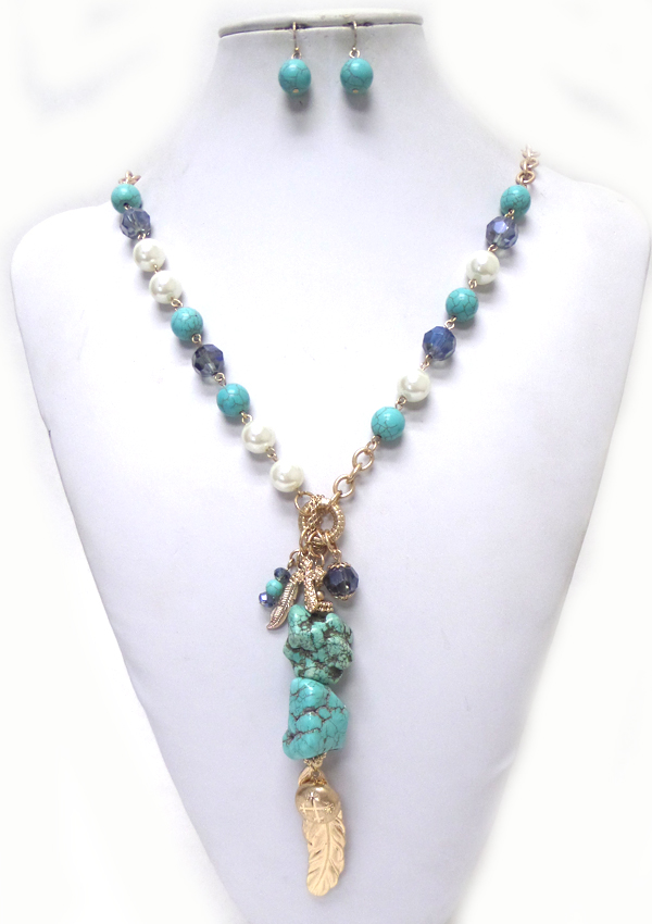 WHOLESALE LARGE BEADS WITH STONE DROP AND METAL FEATHER NECKACE SET 413696