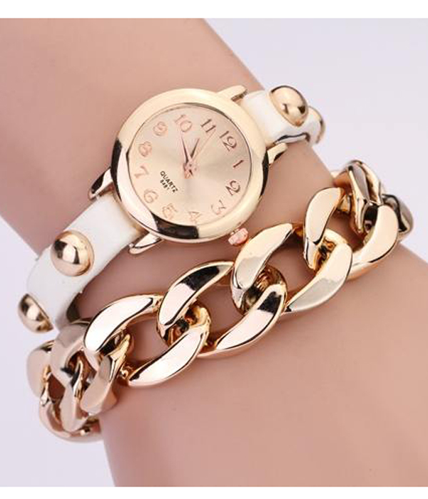 WHOLESALE METAL CHAIN AND LEATHER BAND WRIST WRAP FASHION WATCH 429103