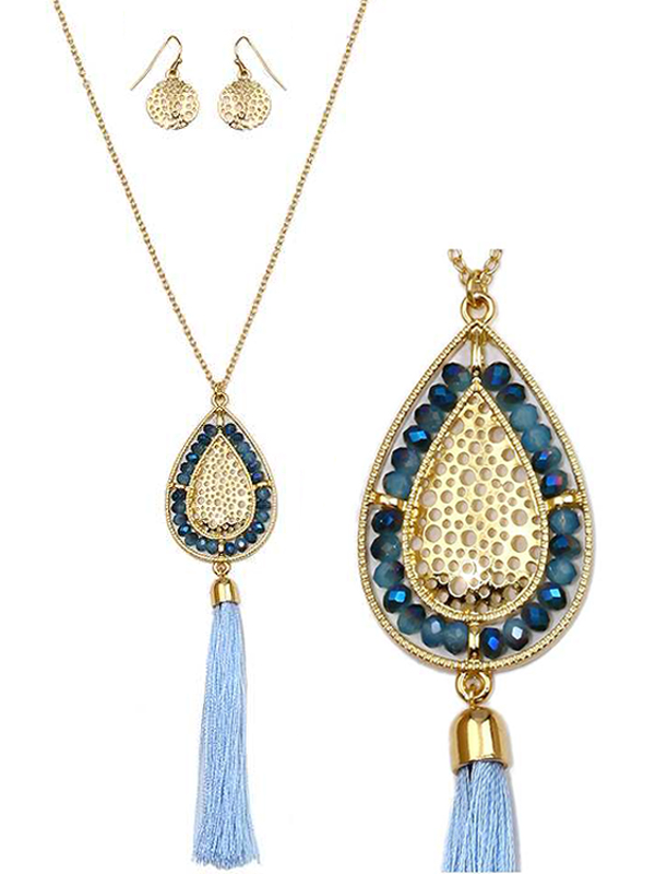 WHOLESALE TEARDROP METAL FILIGREE AND GLASS BEAD AND LONG TASSEL NECKLACE SET 429389