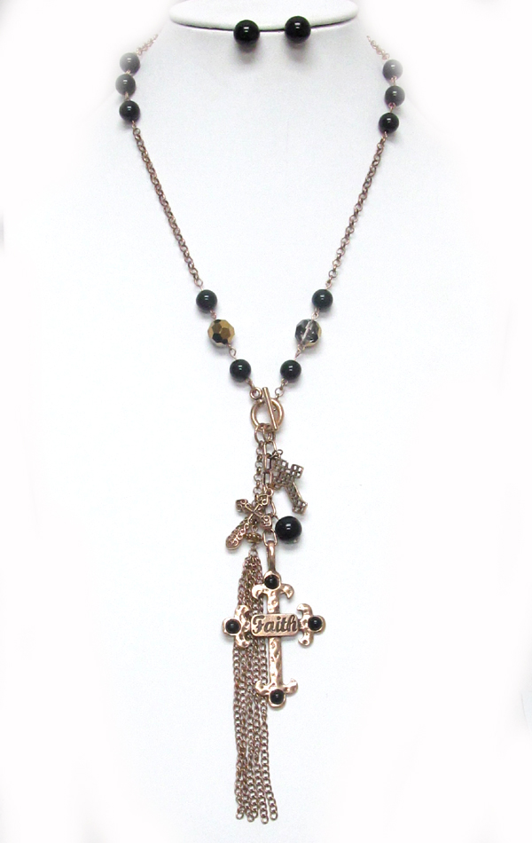 Mixed crosses charm and tassel drop beads chain long necklace set