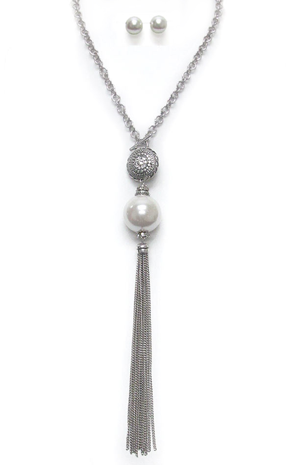 Large pearl ball and long metal tassel drop long necklace set