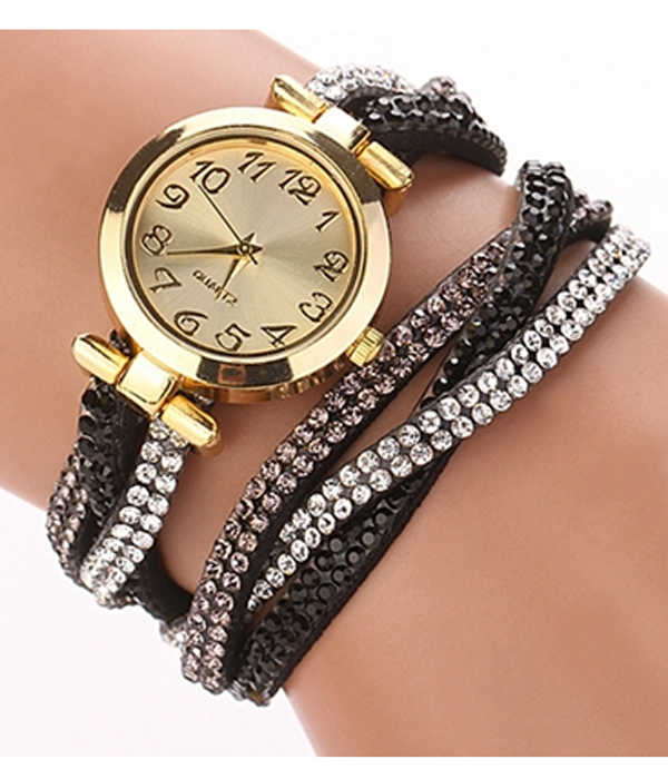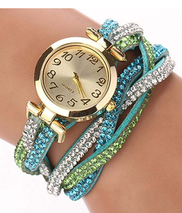 WHOLESALE 2 LAYER CRYSTAL STUD BRAIDED LEATHER WRAP AROUND WATCH 432042