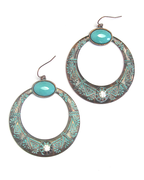 WHOLESALE AZTEC TEXTURED TURQUOISE AND CRYSTAL HOOP DROP EARRING -WESTERN 432254