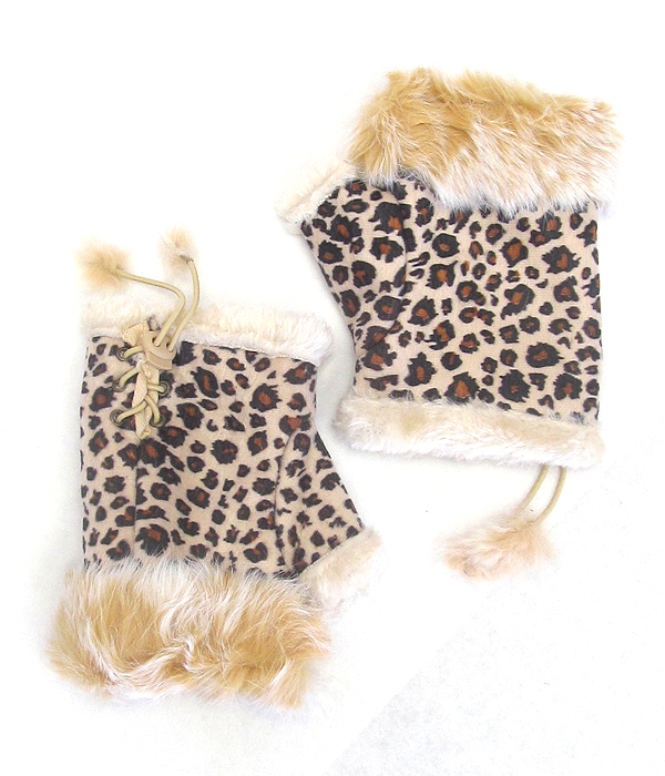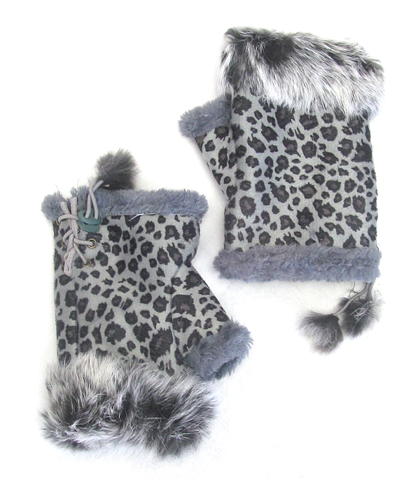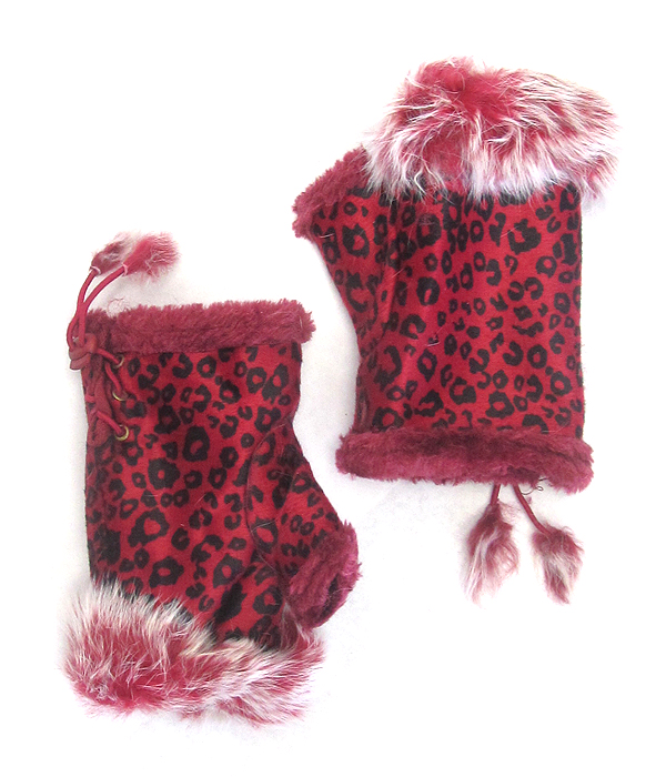 Animal print faux fur open fingertip mitten gloves