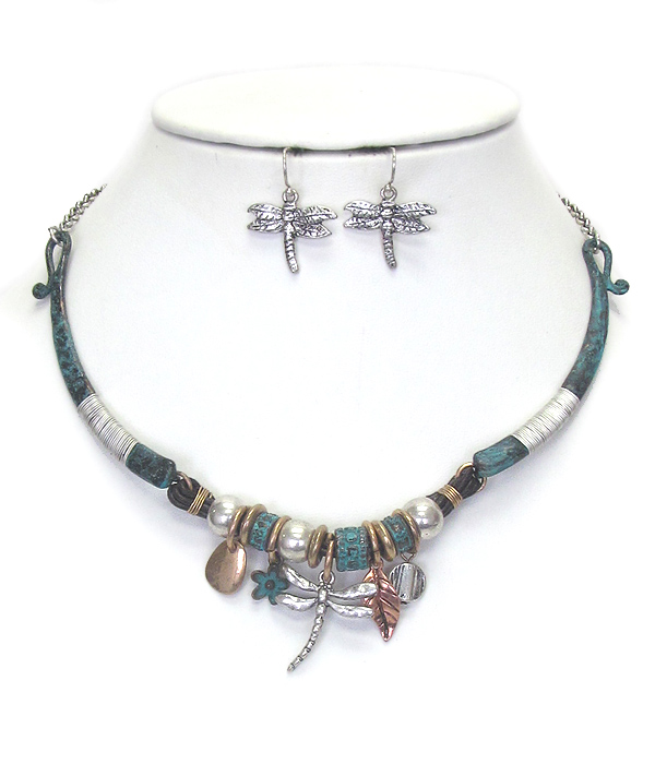 WHOLESALE VINTAGE THEME MIX RONDELLE AND CHARM WIRE WRAP NECKLACE SET - DRAGONFLY 433822