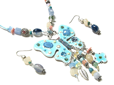 WHOLESALE HAND PAINTED CRYSTAL BUTTERFLY WITH NATURAL STONE NECKLACE AND EARRING SET 63748