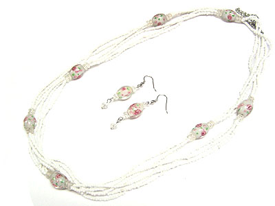 WHOLESALE FLOWER GLASS BEADS AND SEED BEADS LONG NECKLACE AND EARRING 78799