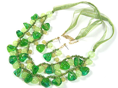 WHOLESALE MULTI RESIN BEADS DOUBLE LAYER RIBBON STRAP NECKLACE AND EARRING SET 78879