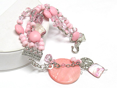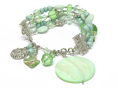 WHOLESALE NATURAL MATERIAL ROUND CHARM DANGLE AND STONE AND GLASS BEADS MULTI ROW LINK BRACELET 78958