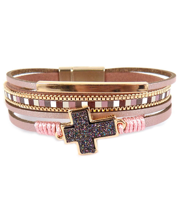 WHOLESALE MULTI LAYER LEATHERETTE AND CRYSTAL CROSS MAGNETIC BRACELET 466291