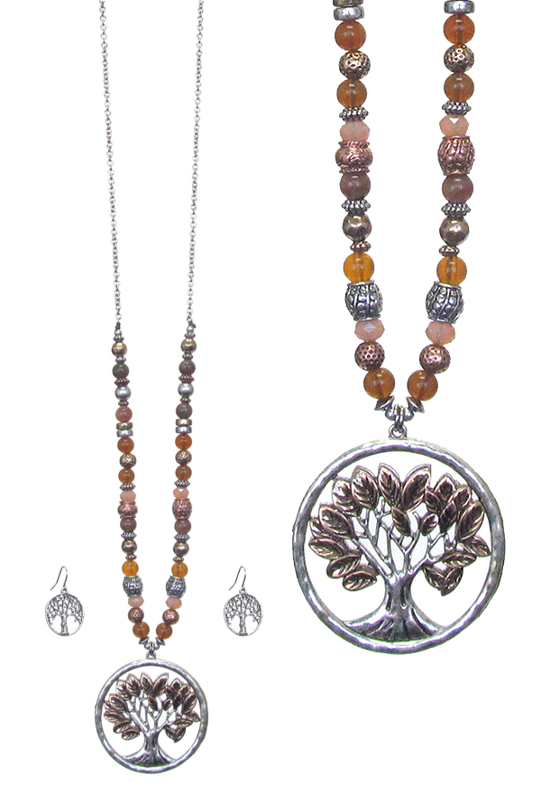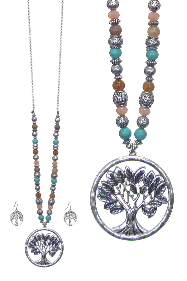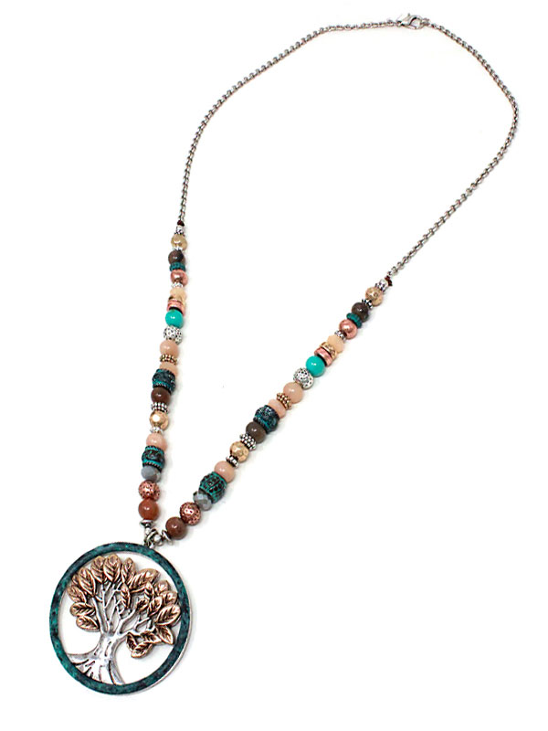 WHOLESALE VINTAGE METAL TREE OF LIFE PENDANT AND SEMI PRECIOUS STONE BEAD NECKLACE 479401